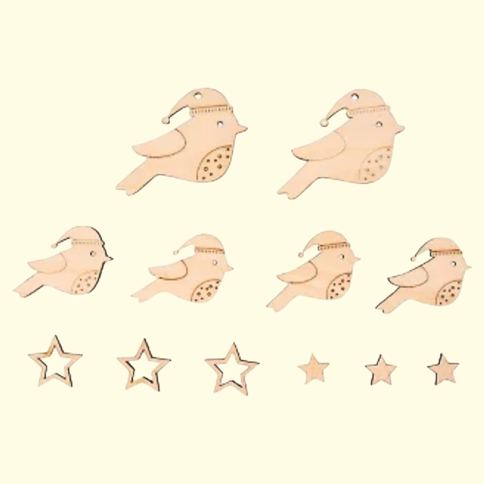 Dekorative Holzfiguren in Form von Vögeln und Sternen – perfekt für winterliche und weihnachtliche Bastelideen, Anhänger, Girlanden oder Geschenkverzierungen. Gefertigt aus FSC-zertifiziertem Holz für nachhaltige Kreativprojekte.