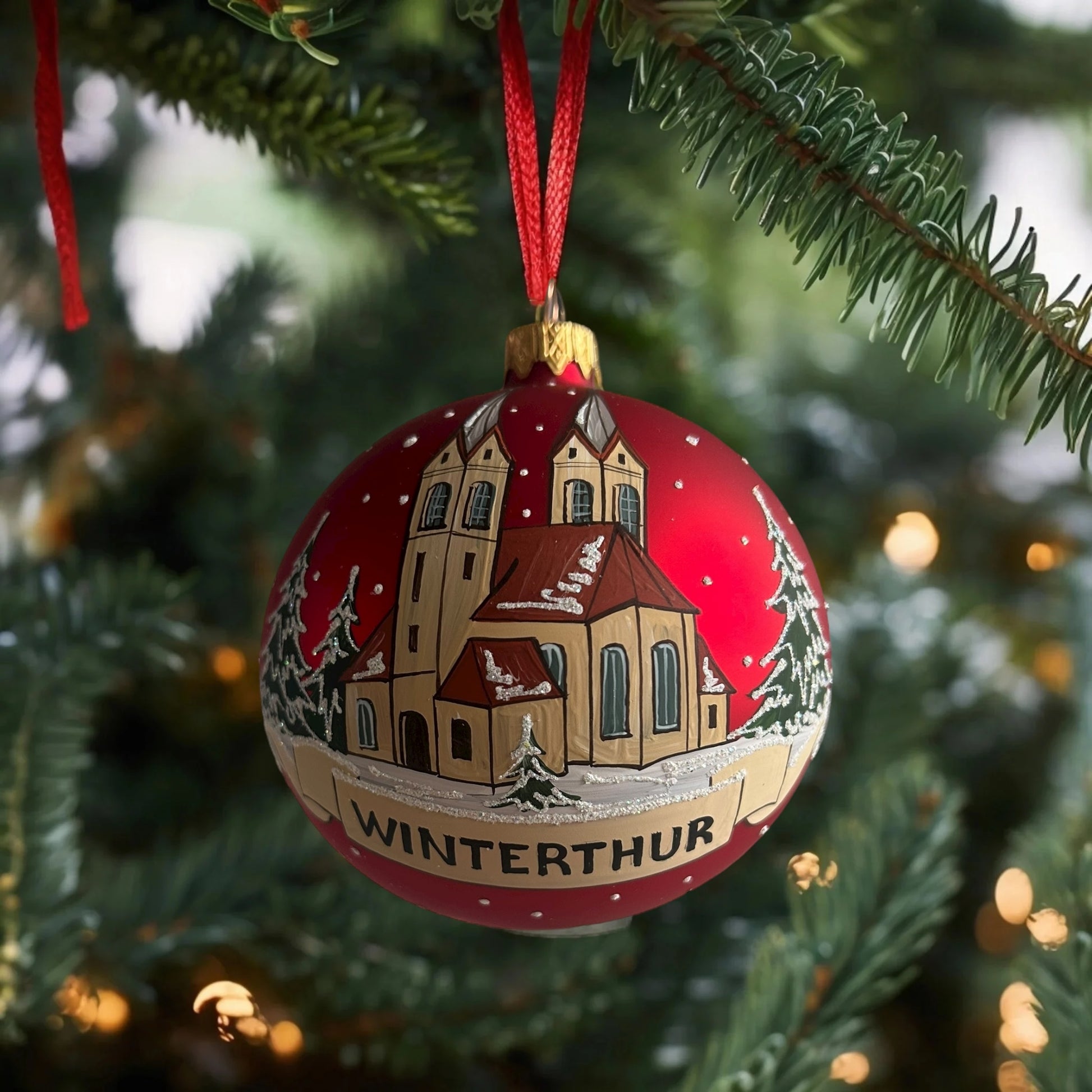 Die Weihnachtskugel „Winterthur Kirche“ vereint Schweizer Handwerkskunst mit weihnachtlicher Eleganz und bringt festliche Wärme in Ihr Zuhause. 🎄