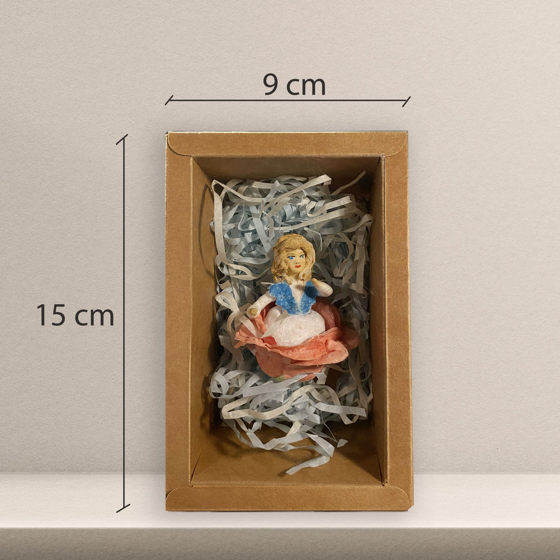 Seltene handgefertigte Figur aus gesponnener Baumwolle. Das Däumelinchen wurde kunstvoll um einen Drahtkern geformt und bemalt – ein charmantes Stück Weihnachtsgeschichte und ein begehrtes Sammlerobjekt.