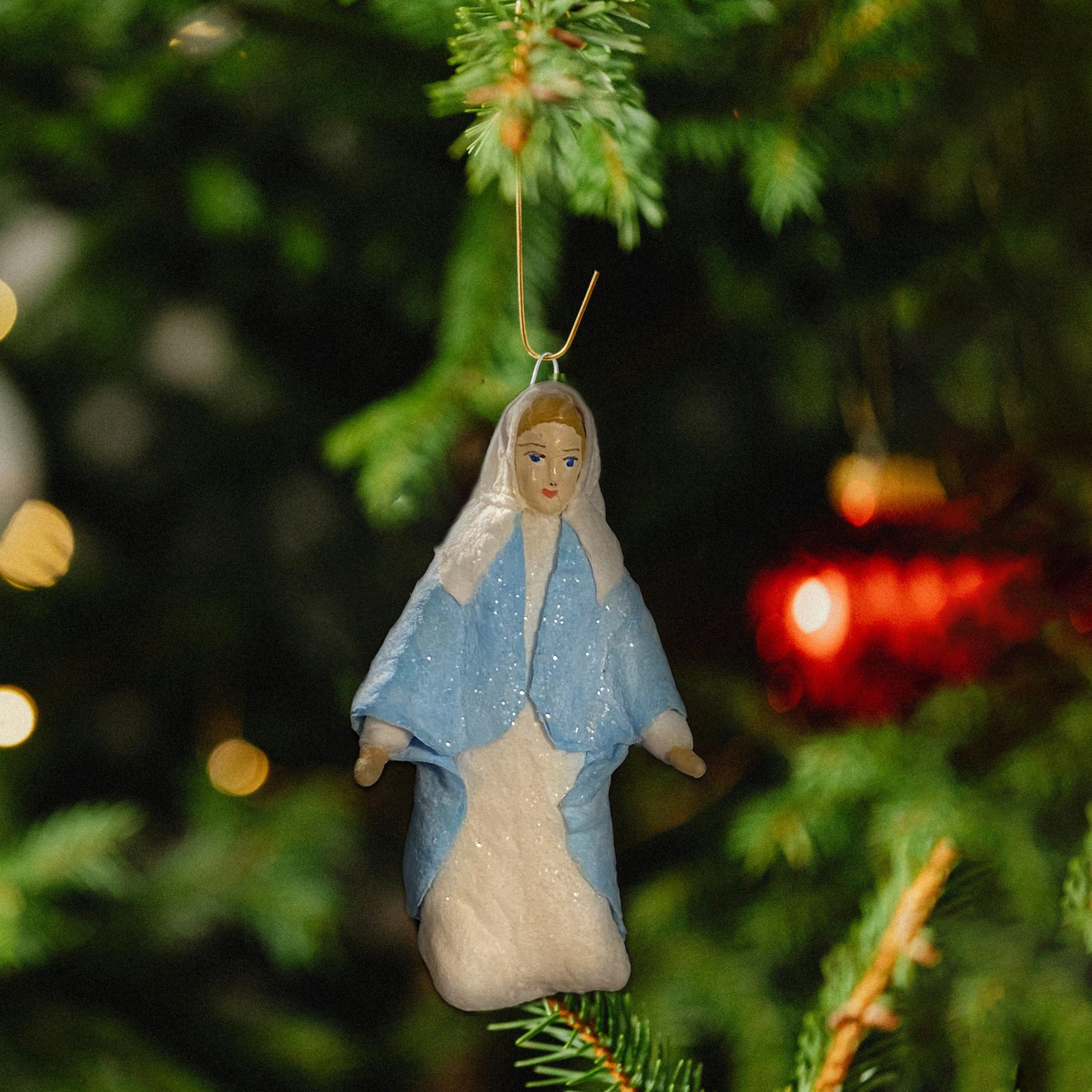 Seltene handgefertigte Figur aus gesponnener Baumwolle. Die Maria wurde kunstvoll um einen Drahtkern geformt und bemalt – ein charmantes Stück Weihnachtsgeschichte und ein begehrtes Sammlerobjekt.