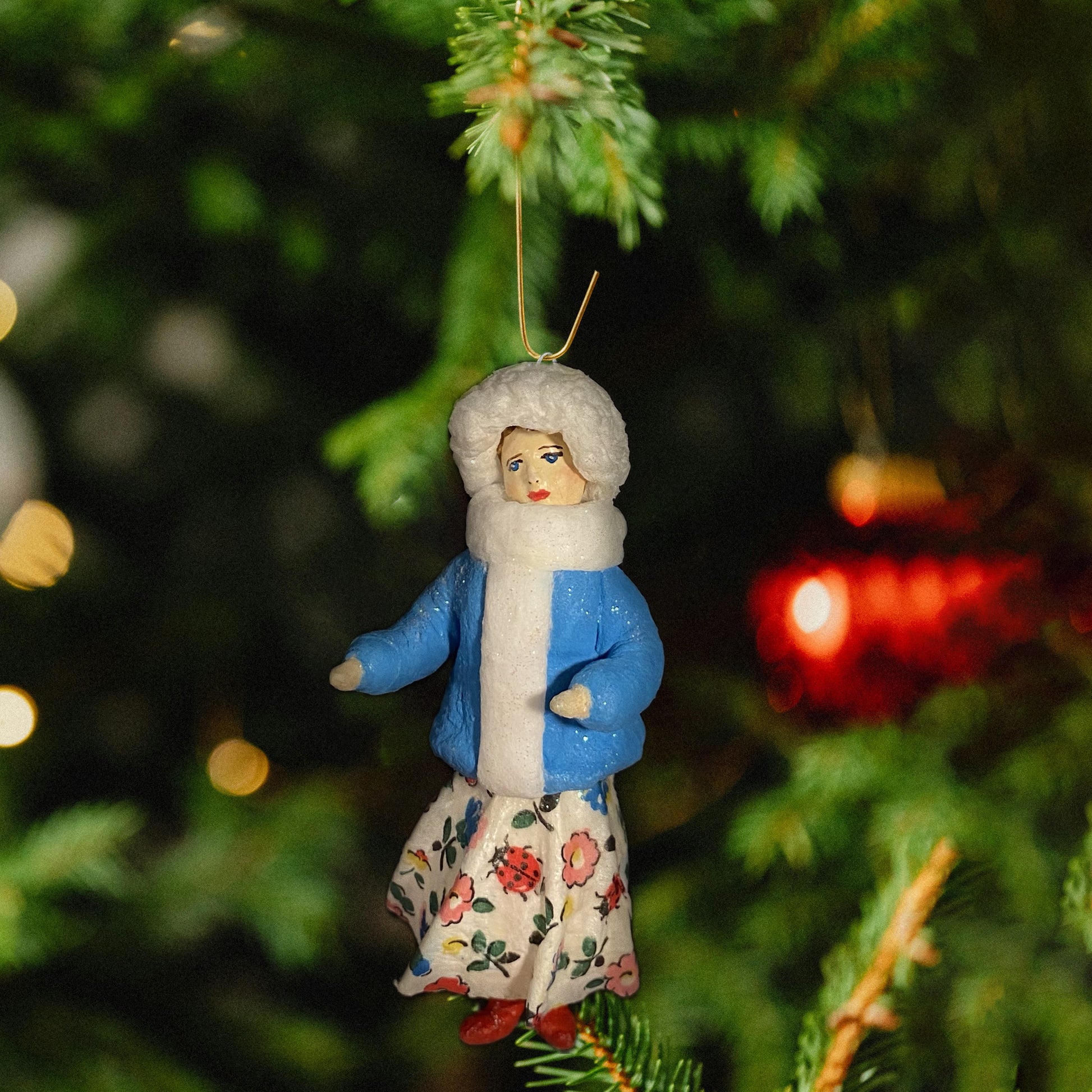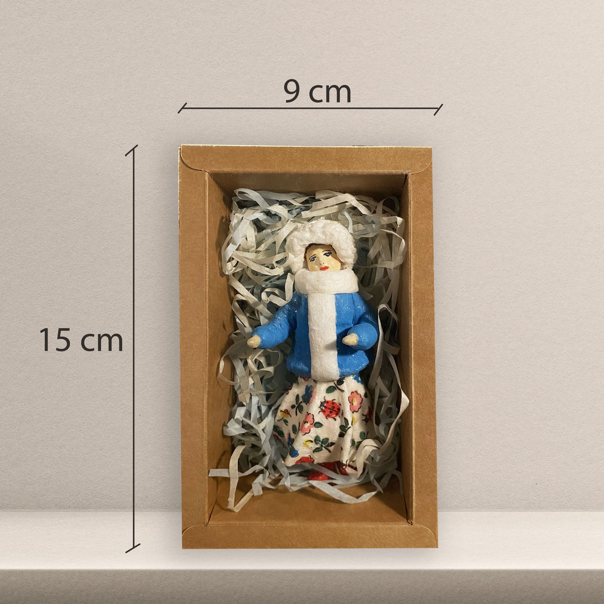 Seltene handgefertigte Figur aus gesponnener Baumwolle. Die Frau im Winterkleid wurde kunstvoll um einen Drahtkern geformt und bemalt – ein charmantes Stück Weihnachtsgeschichte und ein begehrtes Sammlerobjekt.