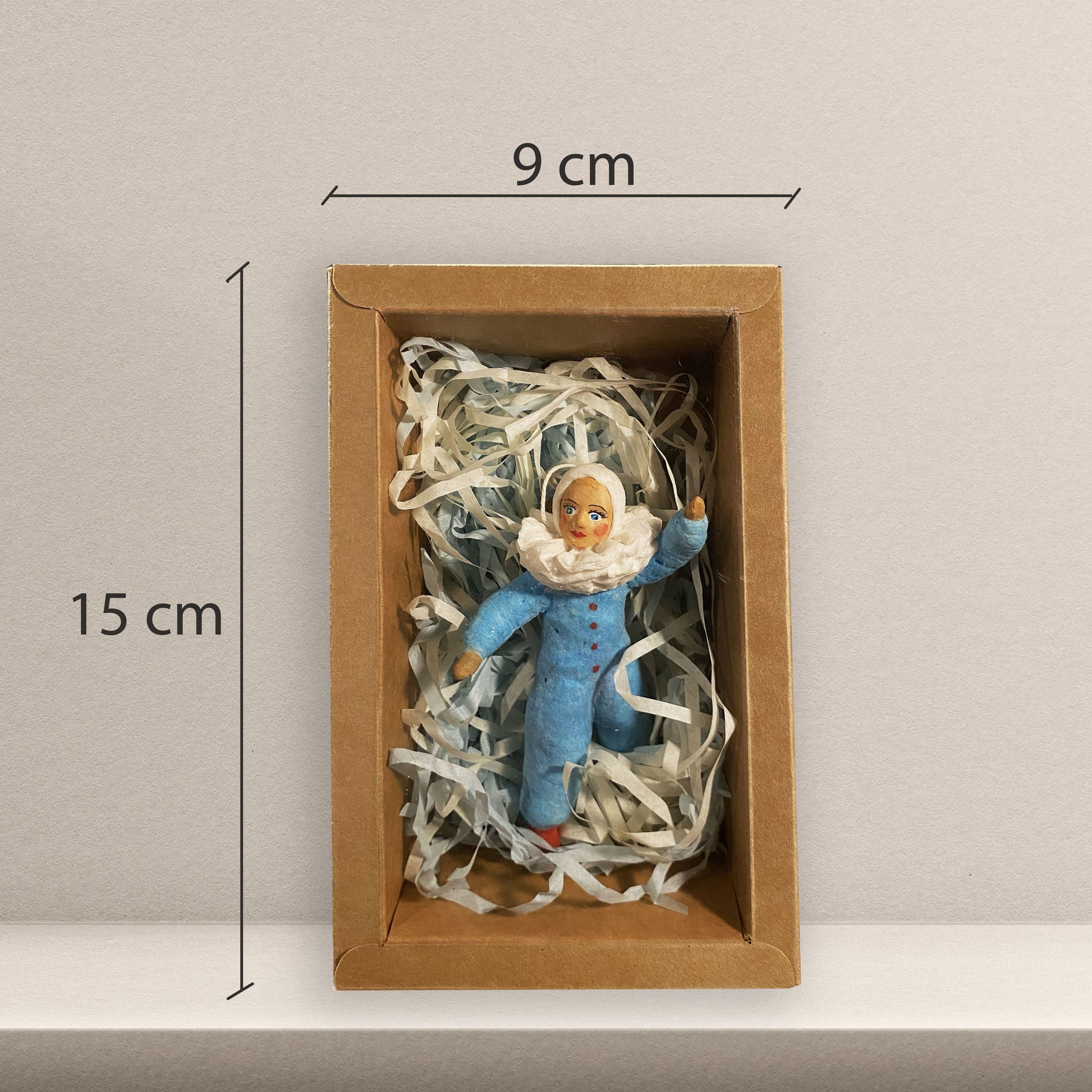 Seltene handgefertigte Figur aus gesponnener Baumwolle. Das Winterkind wurde kunstvoll um einen Drahtkern geformt und bemalt – ein charmantes Stück Weihnachtsgeschichte und ein begehrtes Sammlerobjekt.