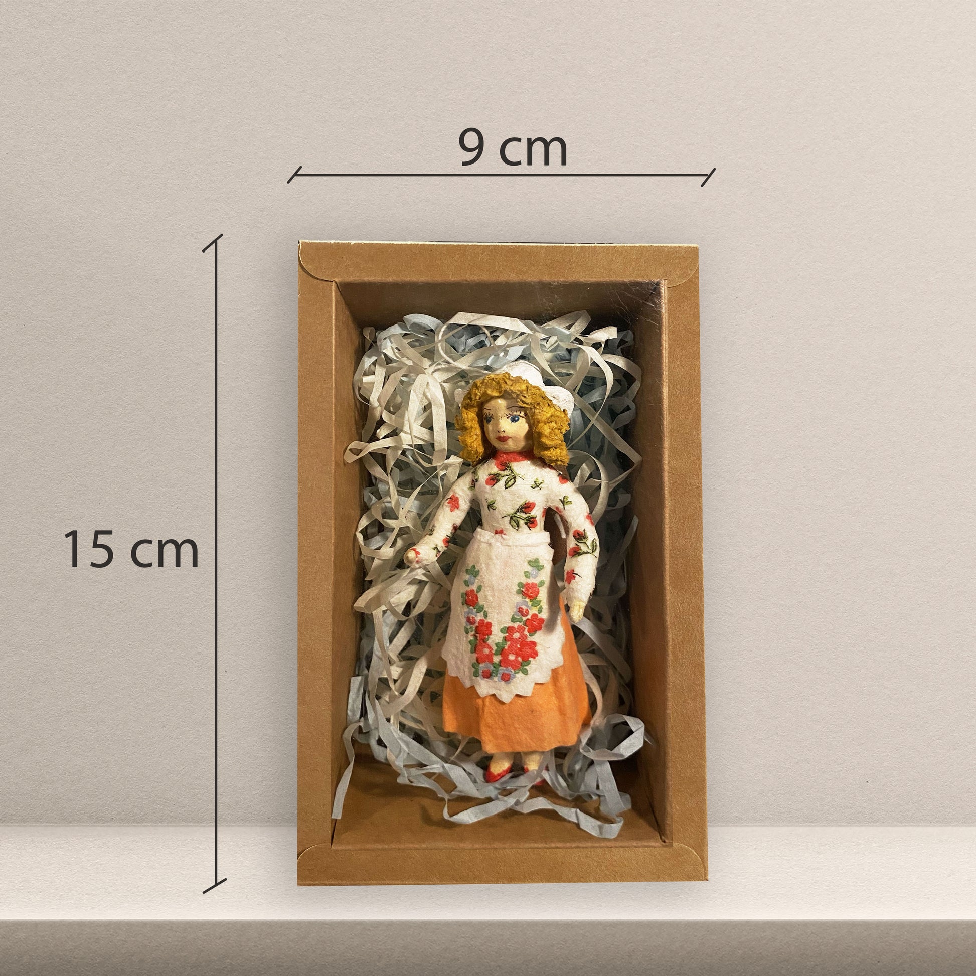 Seltene handgefertigte Figur aus gesponnener Baumwolle. Das Mädchen im Blumenkleid wurde kunstvoll um einen Drahtkern geformt und bemalt – ein charmantes Stück Weihnachtsgeschichte und ein begehrtes Sammlerobjekt.