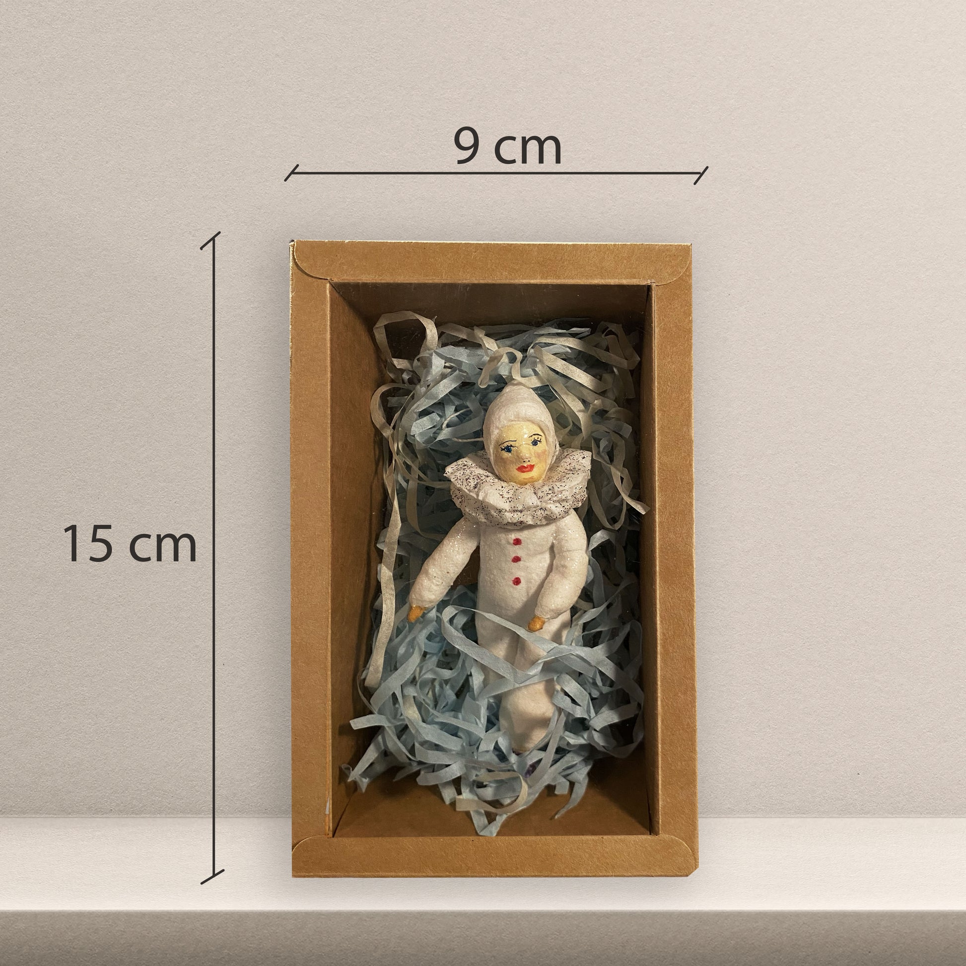 Seltene handgefertigte Figur aus gesponnener Baumwolle. Der Pierrot wurde kunstvoll um einen Drahtkern geformt und bemalt – ein charmantes Stück Weihnachtsgeschichte und ein begehrtes Sammlerobjekt.