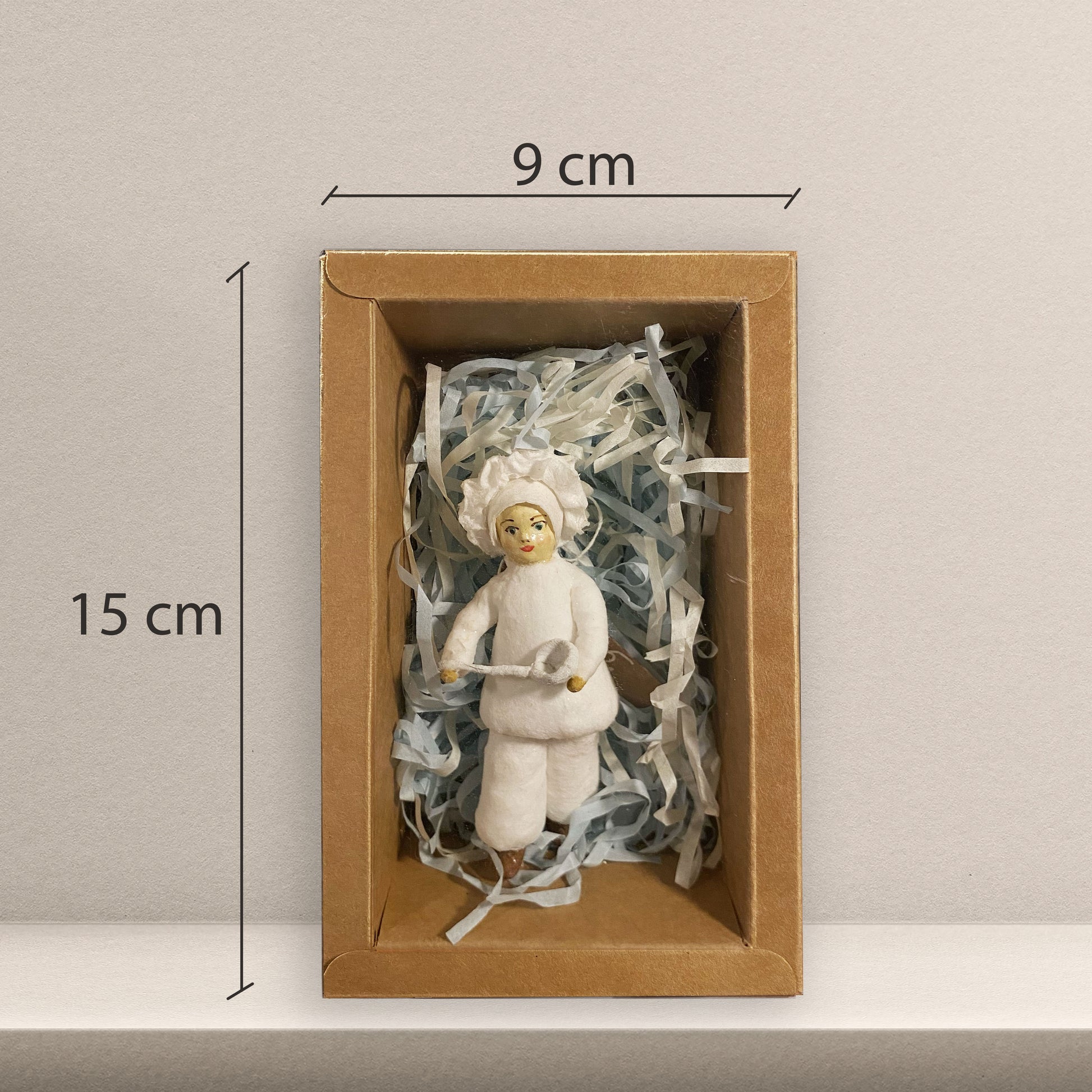 Seltene handgefertigte Figur aus gesponnener Baumwolle. Die junge Köchin wurde kunstvoll um einen Drahtkern geformt und bemalt – ein charmantes Stück Weihnachtsgeschichte und ein begehrtes Sammlerobjekt.