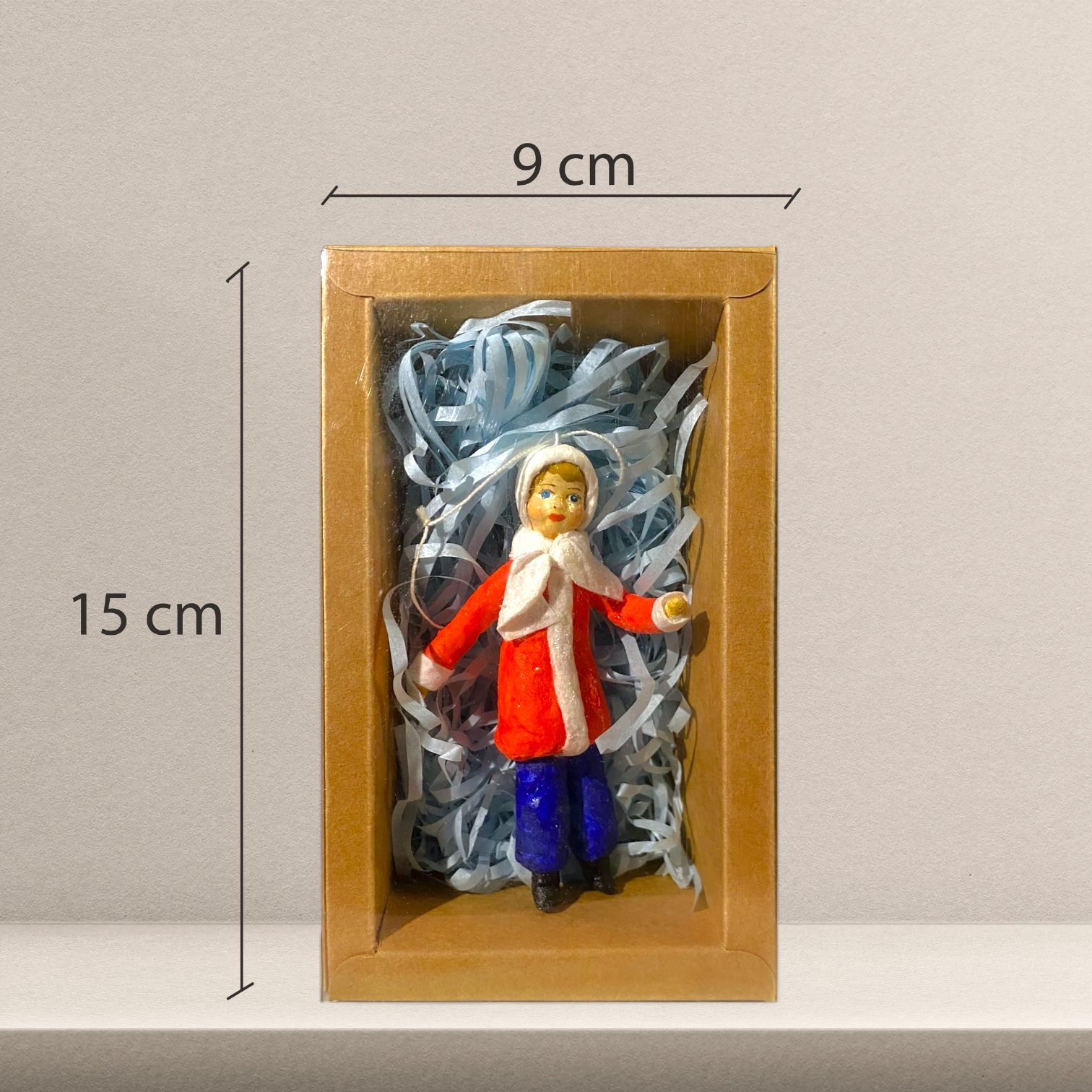 Seltene handgefertigte Figur aus gesponnener Baumwolle. Das Mädchen im roten Mantel wurde kunstvoll um einen Drahtkern geformt und bemalt – ein charmantes Stück Weihnachtsgeschichte und ein begehrtes Sammlerobjekt.