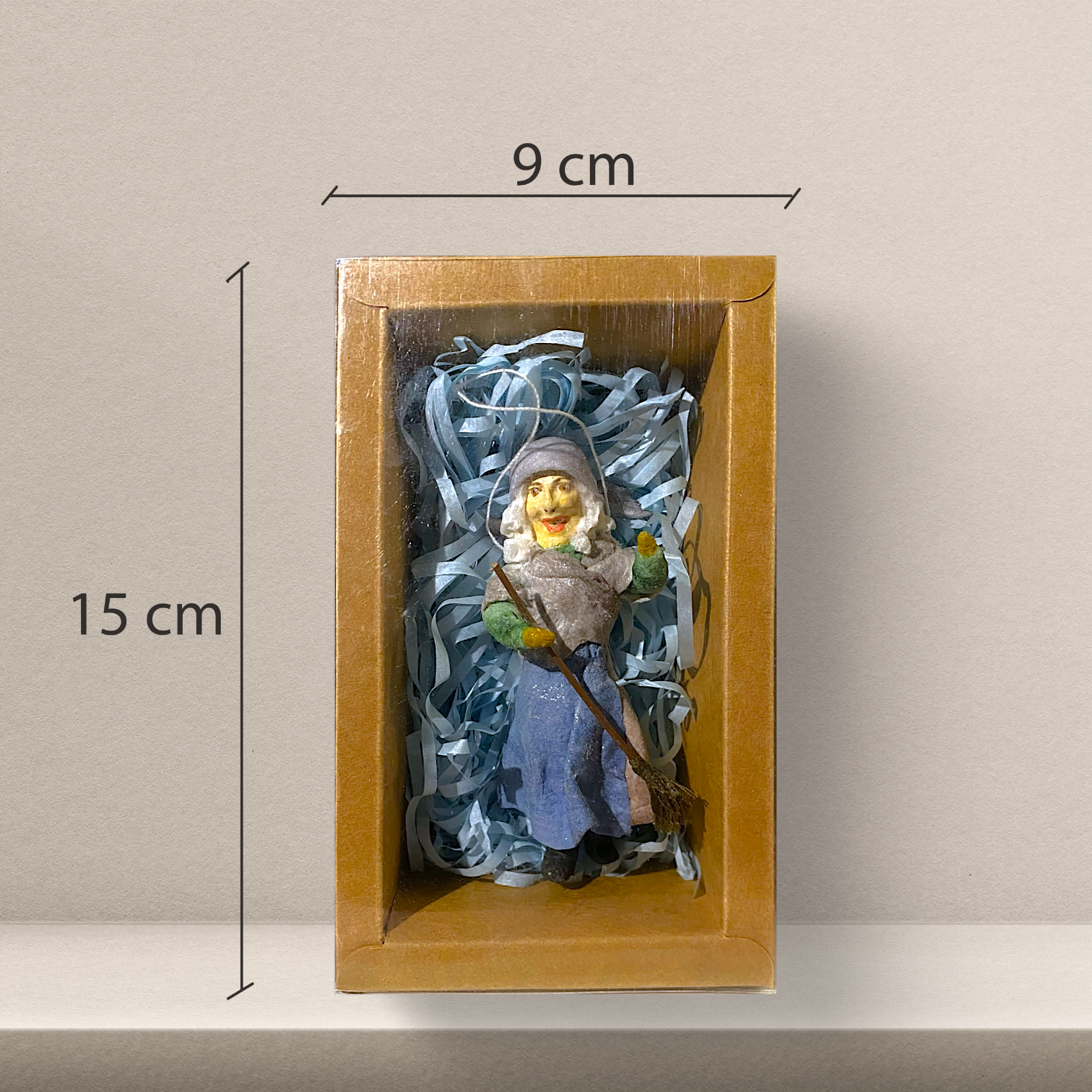 Seltene handgefertigte Figur aus gesponnener Baumwolle. Die Hexe wurde kunstvoll um einen Drahtkern geformt und bemalt – ein charmantes Stück Weihnachtsgeschichte und ein begehrtes Sammlerobjekt.