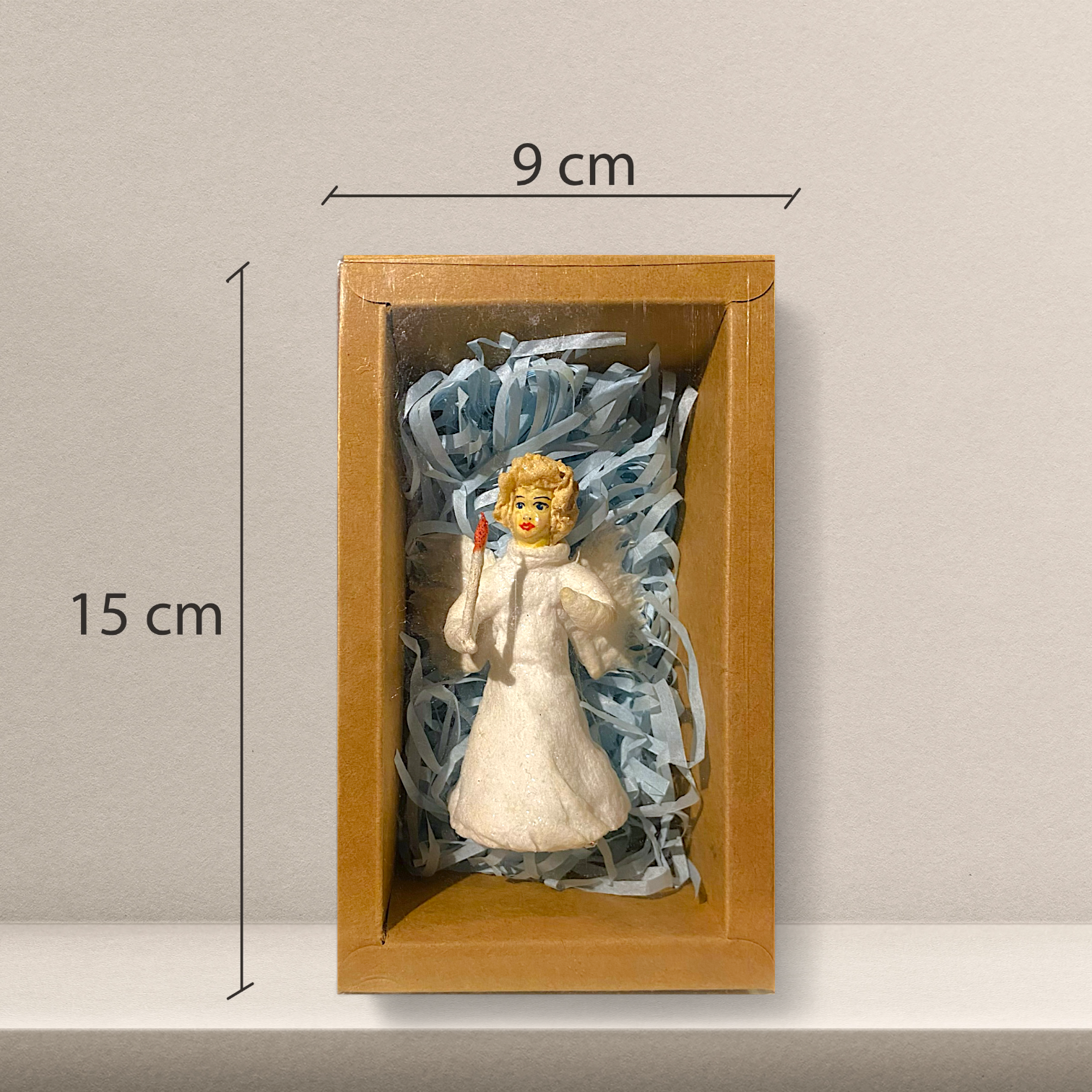 Seltene handgefertigte Figur aus gesponnener Baumwolle. Der Engel mit Kerze wurde kunstvoll um einen Drahtkern geformt und bemalt – ein charmantes Stück Weihnachtsgeschichte und ein begehrtes Sammlerobjekt.
