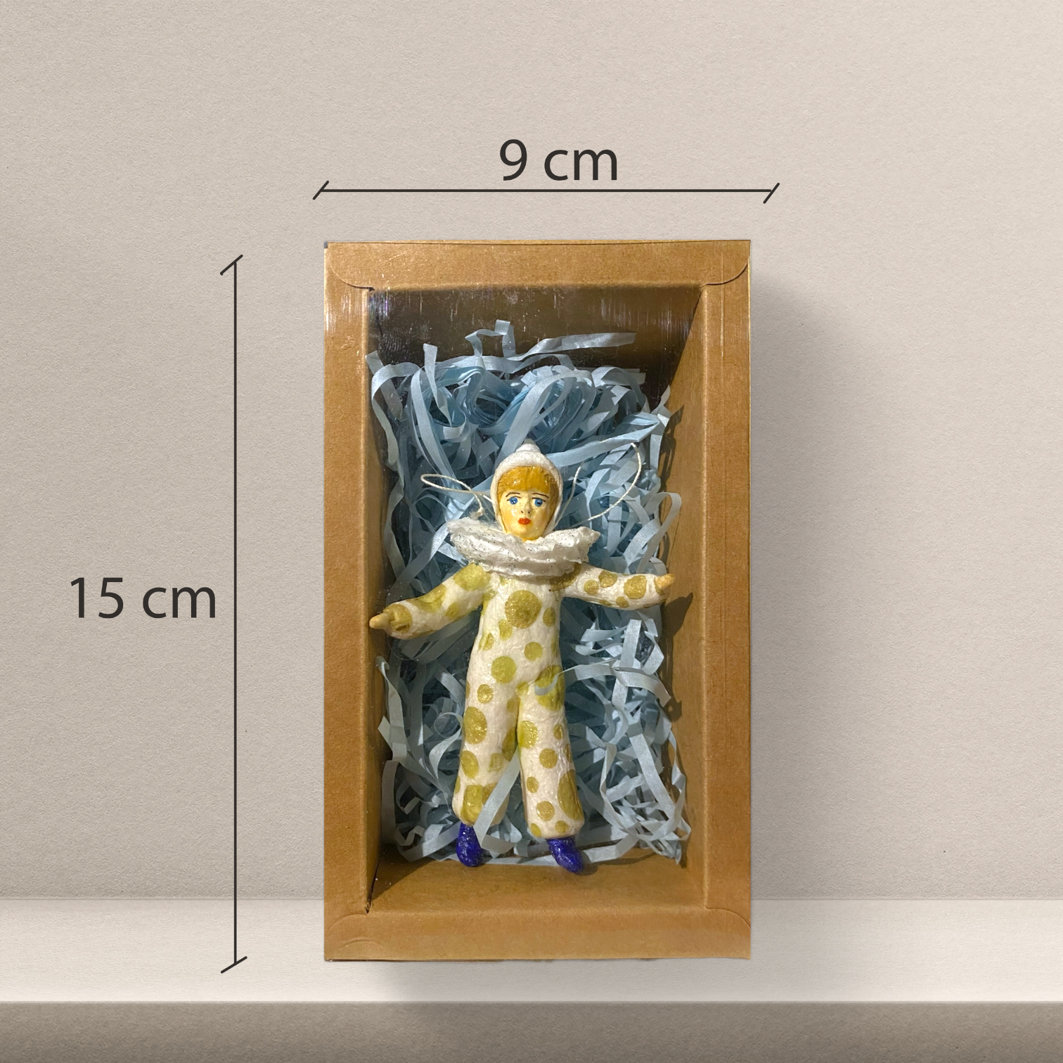 Weihnachtspuppe Clown im gold-punktierten Kostüm