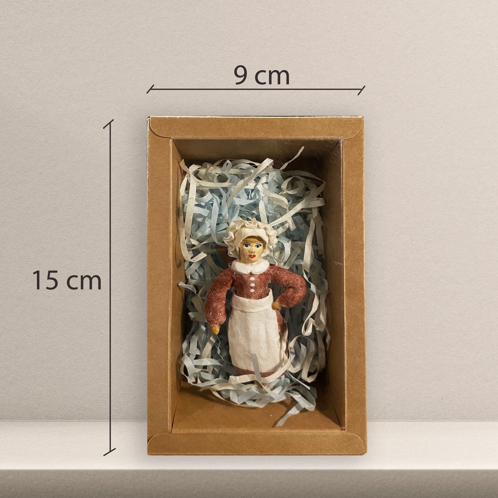 Seltene handgefertigte Figur aus gesponnener Baumwolle. Die Köchin mit brauner Schürze wurde kunstvoll um einen Drahtkern geformt und bemalt – ein charmantes Stück Weihnachtsgeschichte und ein begehrtes Sammlerobjekt.