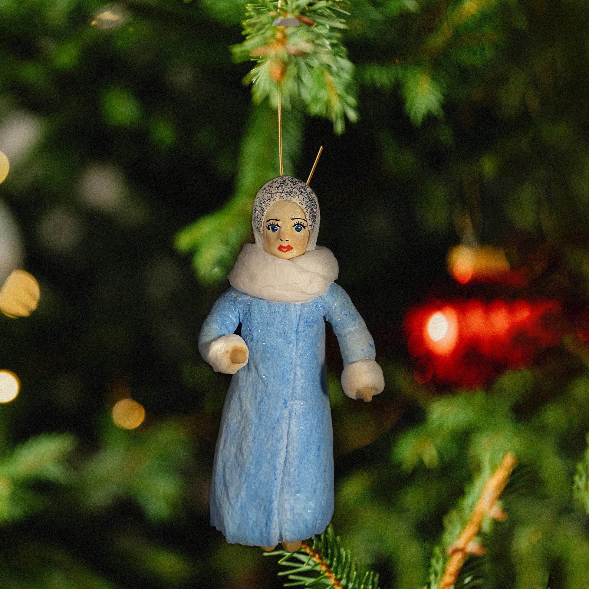 Seltene handgefertigte Figur aus gesponnener Baumwolle. Das Schneemädchen wurde kunstvoll um einen Drahtkern geformt und bemalt – ein charmantes Stück Weihnachtsgeschichte und ein begehrtes Sammlerobjekt.