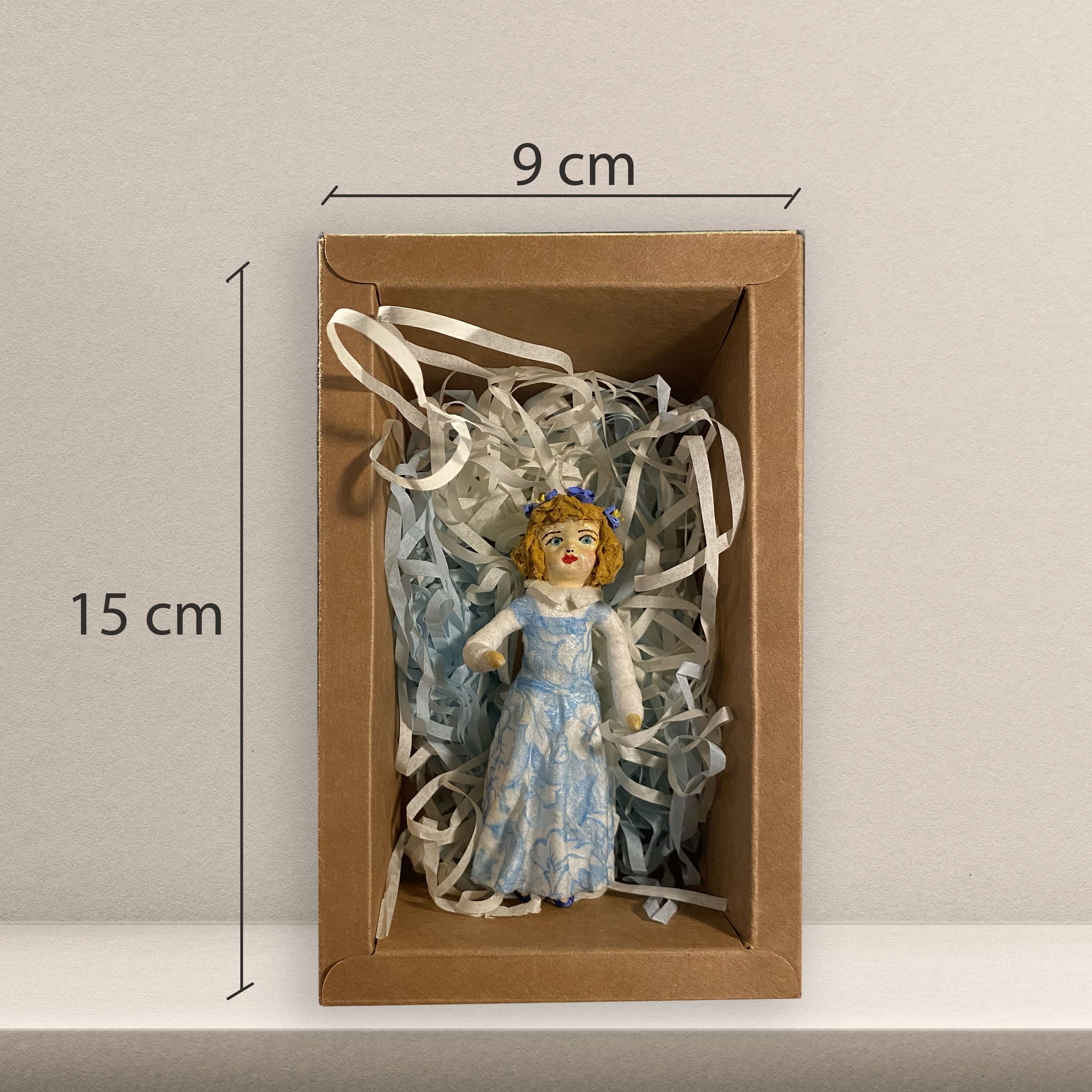 Seltene handgefertigte Figur aus gesponnener Baumwolle. Das Bauernmädchen in Blau wurde kunstvoll um einen Drahtkern geformt und bemalt – ein charmantes Stück Weihnachtsgeschichte und ein begehrtes Sammlerobjekt.