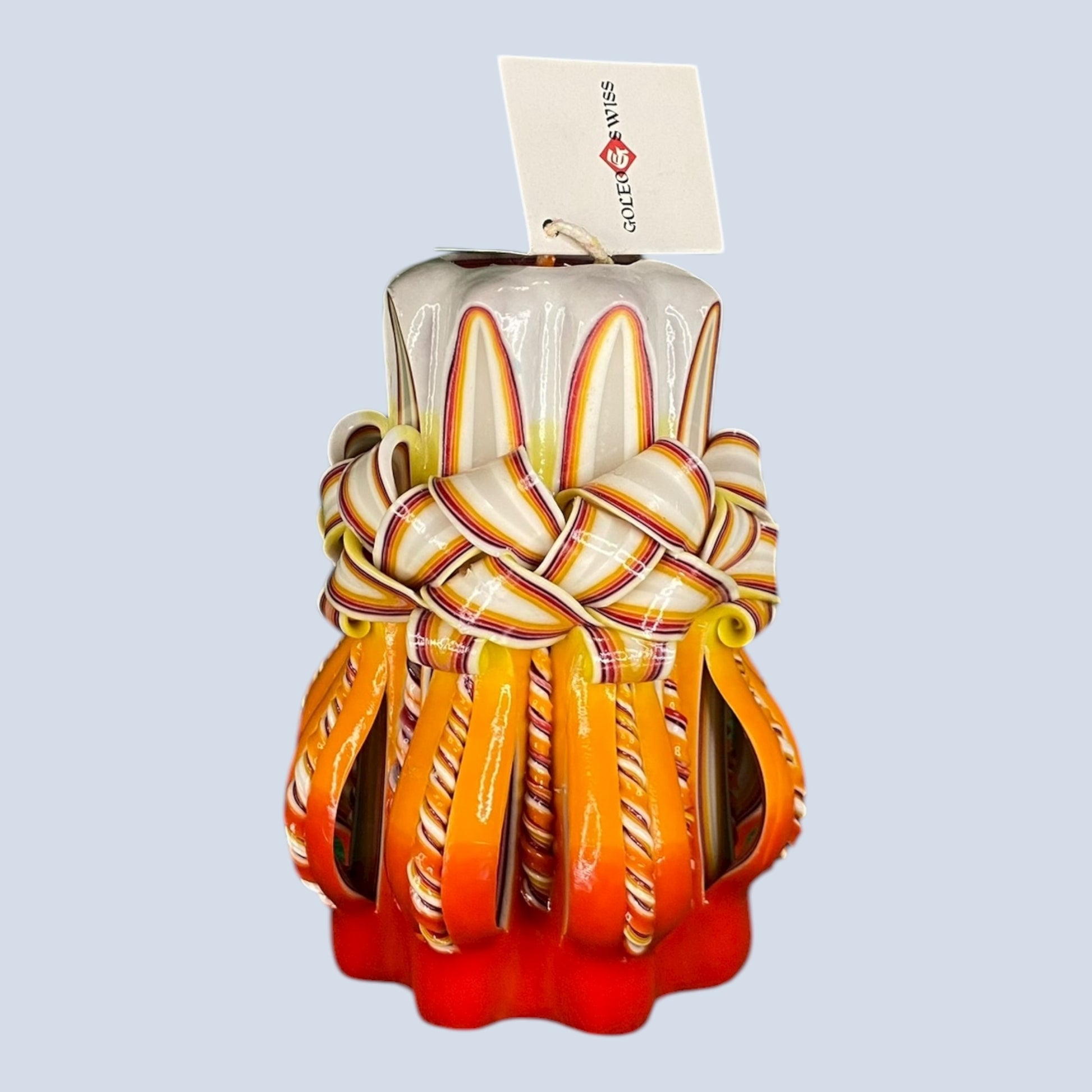 Diese kunstvoll geschnitzte Kerze wird von Hand gefertigt – mit einem scharfen Messer schneidet der Kerzenkünstler feine Muster in das warme Wachs. So entsteht aus jedem Stück ein Unikat voller Charme, Präzision und Kreativität. Diese besondere Technik macht jede Kerze zu einem kleinen Kunstwerk.