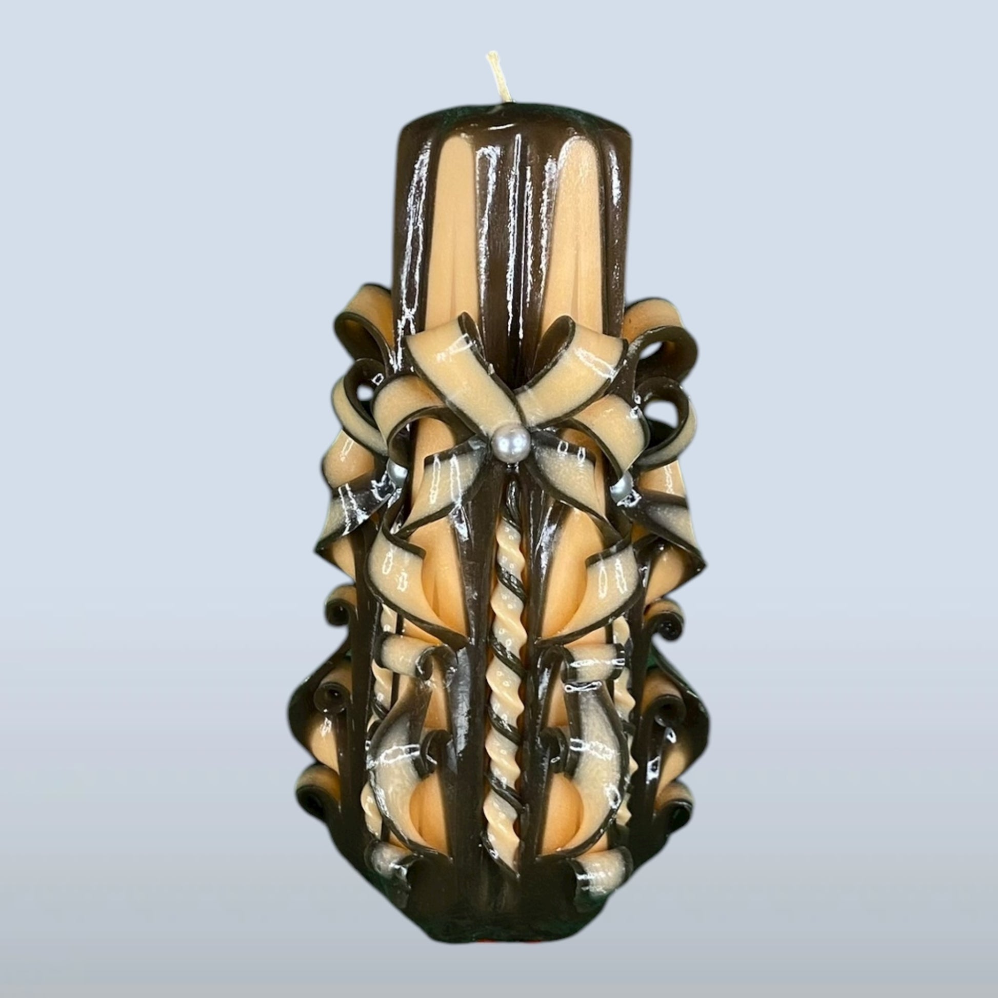 Diese kunstvoll geschnitzte Kerze wird von Hand gefertigt – mit einem scharfen Messer schneidet der Kerzenkünstler feine Muster in das warme Wachs. So entsteht aus jedem Stück ein Unikat voller Charme, Präzision und Kreativität. Diese besondere Technik macht jede Kerze zu einem kleinen Kunstwerk.