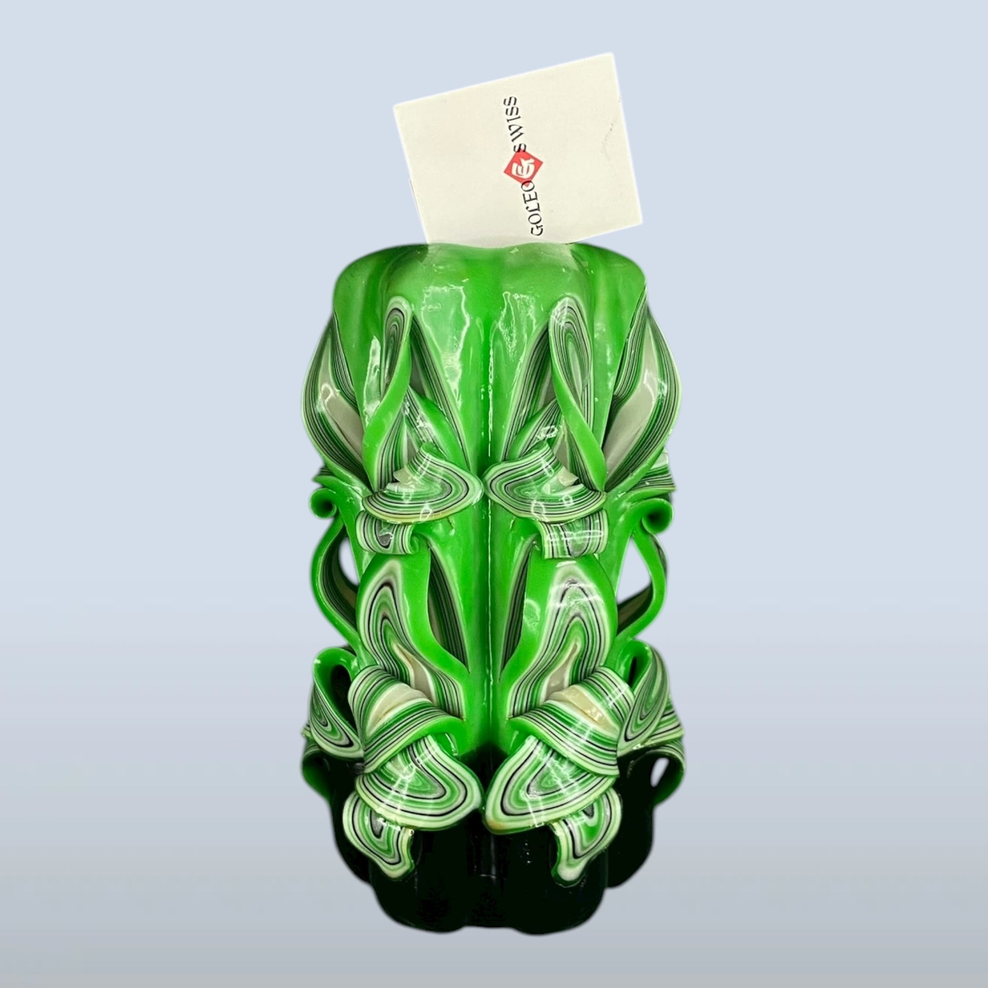 Diese kunstvoll geschnitzte Kerze wird von Hand gefertigt – mit einem scharfen Messer schneidet der Kerzenkünstler feine Muster in das warme Wachs. So entsteht aus jedem Stück ein Unikat voller Charme, Präzision und Kreativität. Diese besondere Technik macht jede Kerze zu einem kleinen Kunstwerk.
