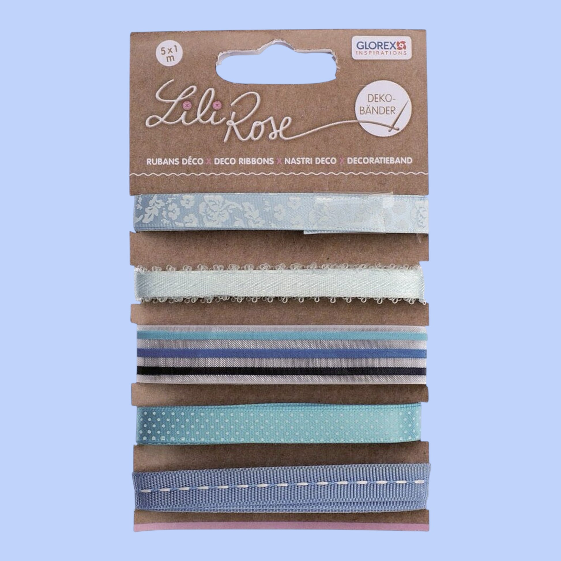 Dekoratives Band-Set in harmonischen Blau-Tönen. Ideal für Bastelarbeiten, Scrapbooking, Geschenkverpackungen und kreative Dekorationen. Unterschiedliche Designs und Strukturen ermöglichen eine Vielzahl an individuellen Gestaltungsmöglichkeiten.