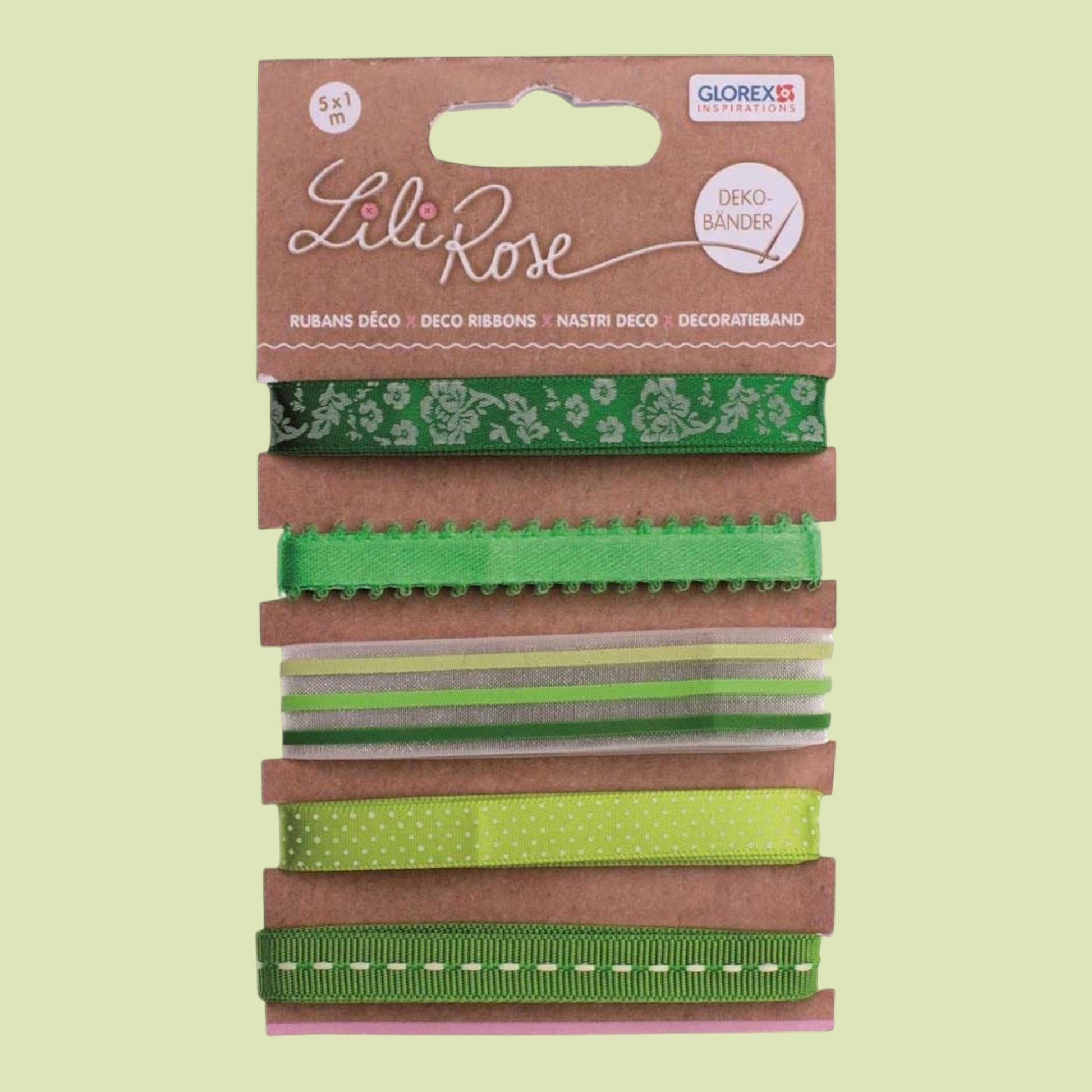 Dekoratives Band-Set in harmonischen Grün-Tönen. Ideal für Bastelarbeiten, Scrapbooking, Geschenkverpackungen und kreative Dekorationen. Unterschiedliche Designs und Strukturen ermöglichen eine Vielzahl an individuellen Gestaltungsmöglichkeiten.