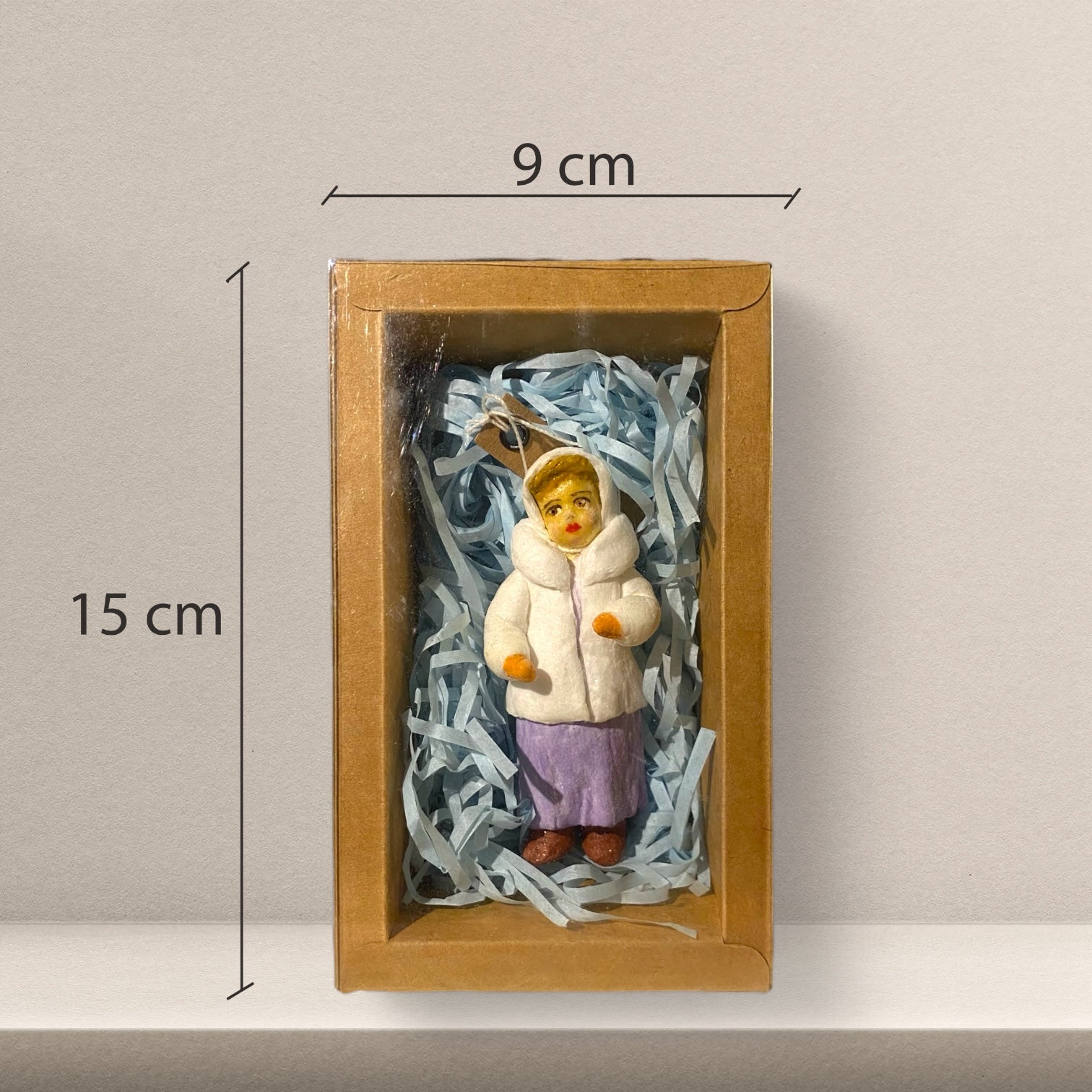 Seltene handgefertigte Figur aus gesponnener Baumwolle. Das Mädchen im Pelzmantel wurde kunstvoll um einen Drahtkern geformt und bemalt – ein charmantes Stück Weihnachtsgeschichte und ein begehrtes Sammlerobjekt.