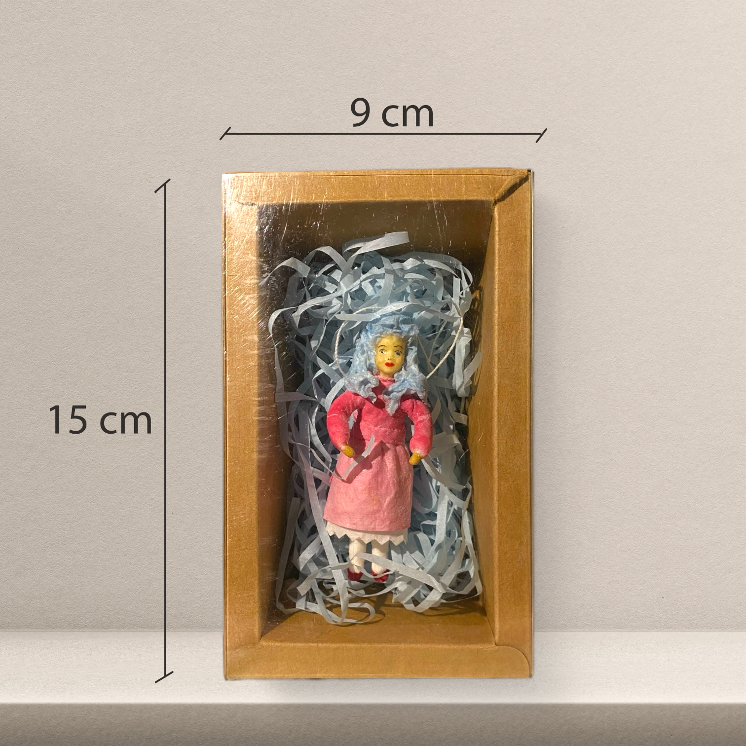 Seltene handgefertigte Figur aus gesponnener Baumwolle. Das Mädchen mit blauen Haaren wurde kunstvoll um einen Drahtkern geformt und bemalt – ein charmantes Stück Weihnachtsgeschichte und ein begehrtes Sammlerobjekt.