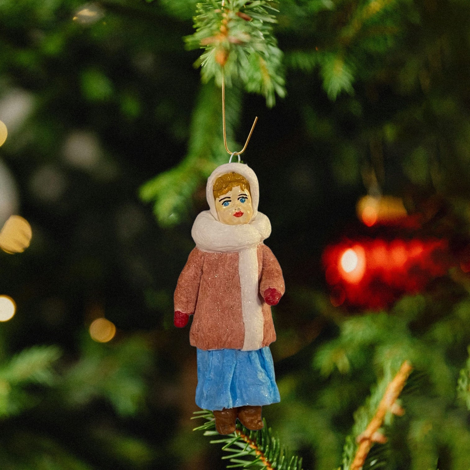 Seltene handgefertigte Figur aus gesponnener Baumwolle. Der Junge in Winterkleidung wurde kunstvoll um einen Drahtkern geformt und bemalt – ein charmantes Stück Weihnachtsgeschichte und ein begehrtes Sammlerobjekt.