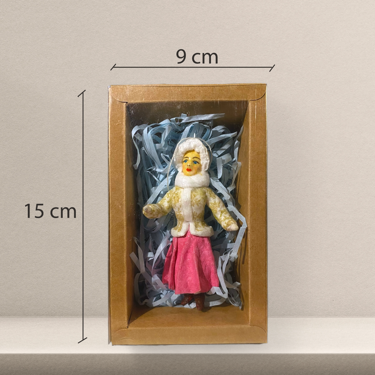 Seltene handgefertigte Figur aus gesponnener Baumwolle. Die Frau im rosa Rock wurde kunstvoll um einen Drahtkern geformt und bemalt – ein charmantes Stück Weihnachtsgeschichte und ein begehrtes Sammlerobjekt.