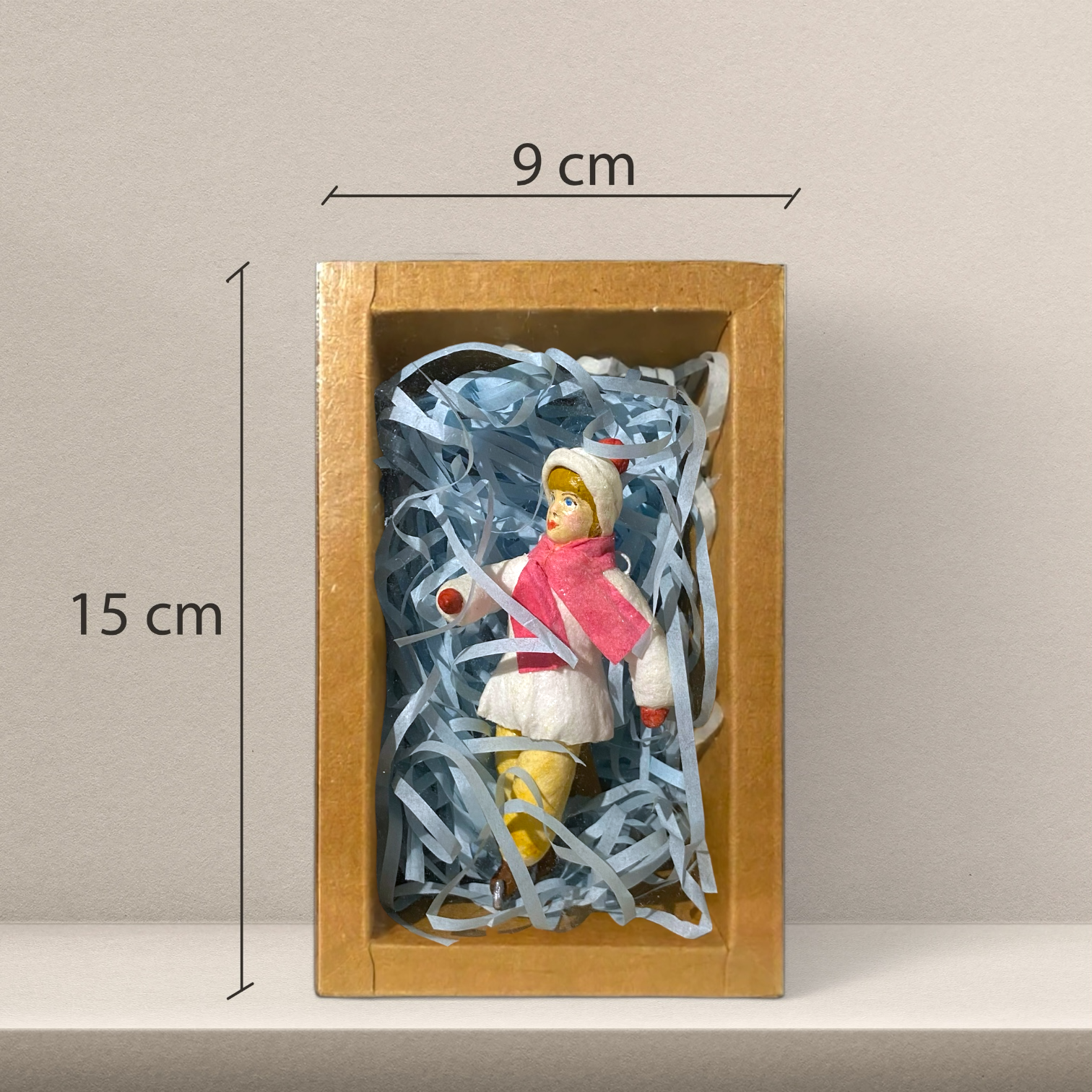 Seltene handgefertigte Figur aus gesponnener Baumwolle. Das Madchen auf Schlittschuhen mit einem rosa Shal wurde kunstvoll um einen Drahtkern geformt und bemalt – ein charmantes Stück Weihnachtsgeschichte und ein begehrtes Sammlerobjekt.